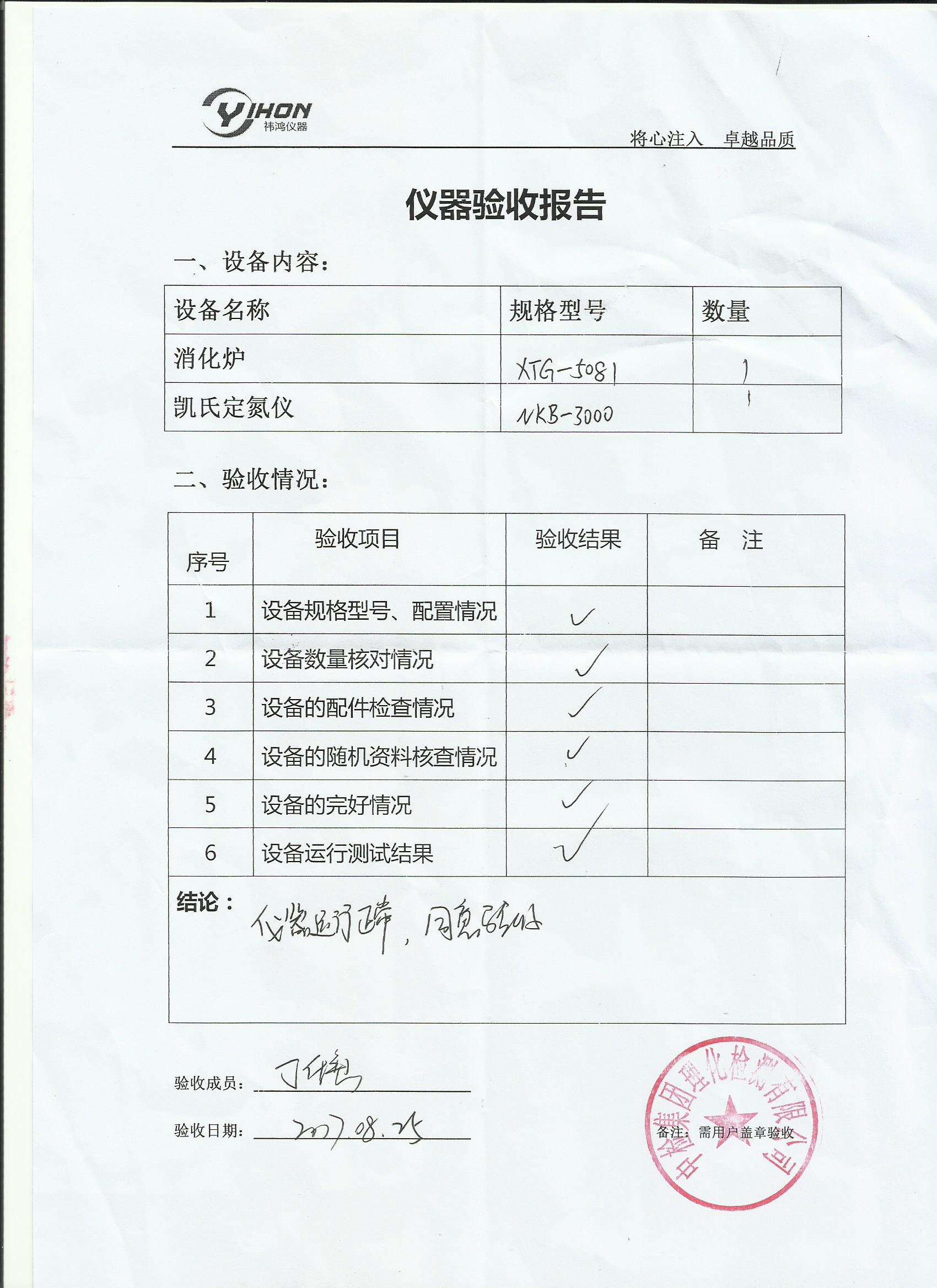 中檢集團理化檢測有限公司采購上海祎鴻提供的凱氏定氮儀NKB3000,紅外消消化爐XTG5081設(shè)備,主要針對土壤等來料的蛋白質(zhì)含量檢測,已順利完成驗收工作。